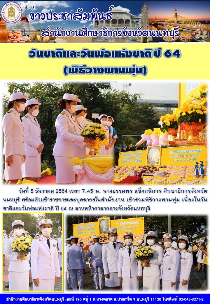 นางธรรมพร แข็งกสิการ ศธจ.นนทบุรี พร้อมด้วยข้าราชการและบุคลากรในสำนักงานฯ เข้าร่วมงานวันชาติและวันพ่อแห่งชาติ ปี 64 (พิธีวางพานพุ่ม) ณ ลานหน้าศาลากลางจังหวัดนนทบุรี (5 ธ.ค.64) ไฟล์แนบ : 641205_2.jpg