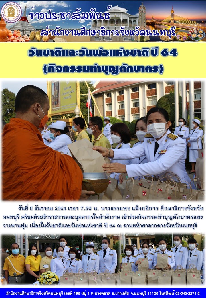 นางธรรมพร แข็งกสิการ ศธจ.นนทบุรี พร้อมด้วยข้าราชการและบุคลากรในสำนักงานฯ เข้าร่วมงานวันชาติและวันพ่อแห่งชาติ ปี 64 (กิจกรรมทำบุญตักบาตร) ณ ลานหน้าศาลากลางจังหวัดนนทบุรี (5 ธ.ค.64) ไฟล์แนบ : 641205_1.jpg