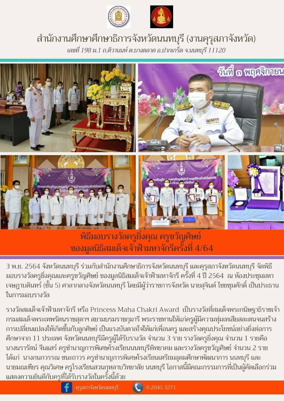 งานคุรุสภาจังหวัดนนทบุรี จัดพิธีมอบรางวัลครูยิ่งคุณ และครูขวัญศิษย์ จังหวัดนนทบุรี ของมูลนิธิสมเด็จเจ้าฟ้ามหาจักรี ครั้งที่ 4/64 ณ ห้องประชุมชั้น 5 ศาลากลางจังหวัดนนทบุรี (3 พ.ย.64) ไฟล์แนบ : 637771.jpg