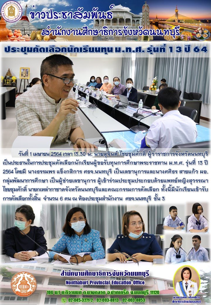 สำนักงาน ศธจ.นนทบุรี จัดประชุมคัดเลือกนักเรียนทุนพระราชทาน ม.ท.ศ.รุ่นที่ 13 ปี 64 ณ ห้องประชุมสำนักงาน ศธจ.นนทบุรี ชั้น 3 (1 เม.ย.64) ไฟล์แนบ : 1_เม.ย.64.jpg