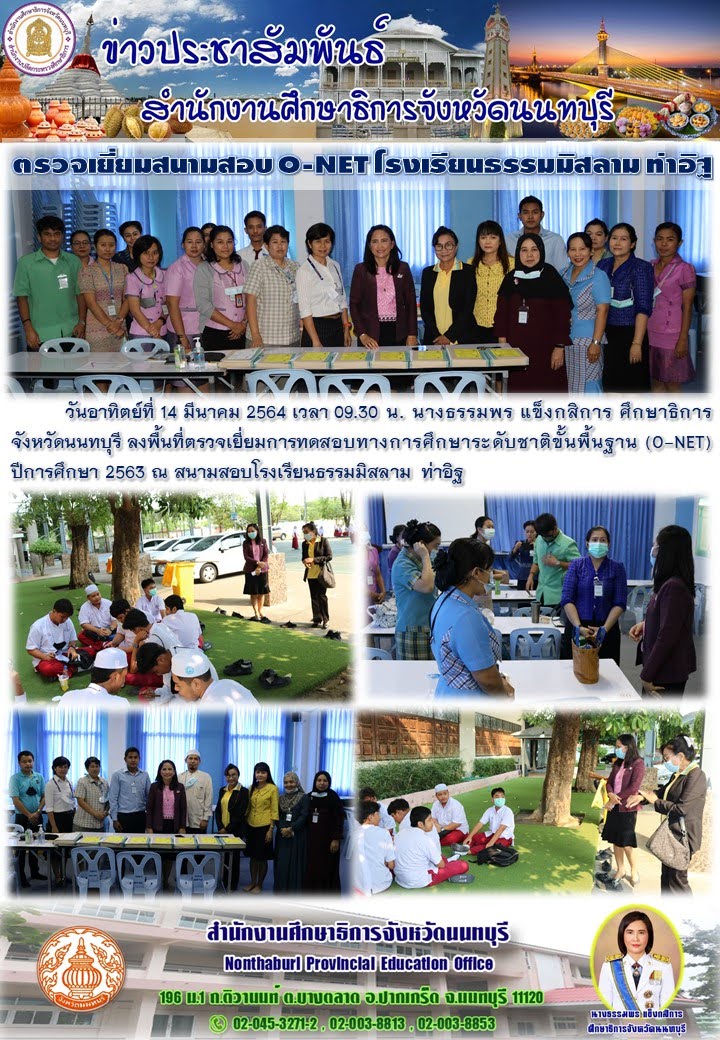 นางธรรมพร แข็งกสิการ ศธจ.นนทบุรี ลงพื้นที่ตรวจเยี่ยมการสอบ O-NET ประจำปีการศึกษา 2563 ณ โรงเรียนธรรมมิสลาม ท่าอิฐ (14 มี.ค.64) ไฟล์แนบ : 14_มี.ค.64_(2).jpg