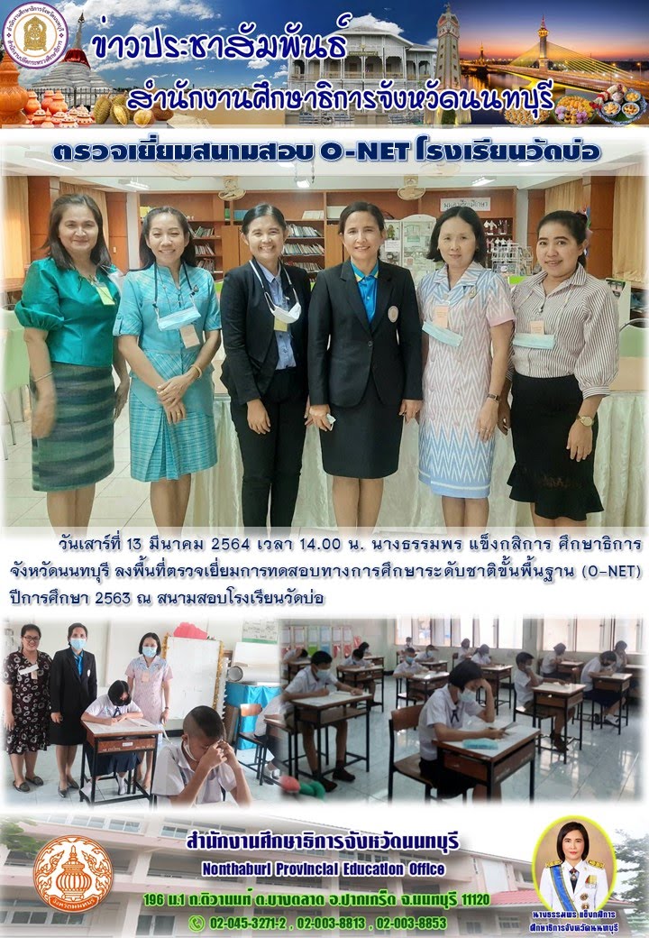 นางธรรมพร แข็งกสิการ ศธจ.นนทบุรี ลงพื้นที่ตรวจเยี่ยมการสอบ O-NET ประจำปีการศึกษา 2563 ณ โรงเรียนวัดบ่อ (13 มี.ค.64) ไฟล์แนบ : 13_มี.ค.64_(2).jpg