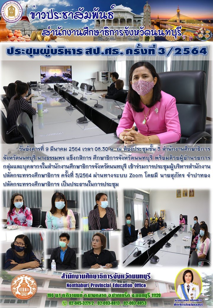สำนักงาน ศธจ.นนทบุรี เข้าร่วมการประชุมผู้บริหาร สป.ศธ. ครั้งที่ 3/2564 ณ ห้องประชุมชั้น 3 สำนักงานศึกษาธิการจังหวัดนทบุรี (9 มี.ค.64) ไฟล์แนบ : 9_มี.ค.64_(1).jpg