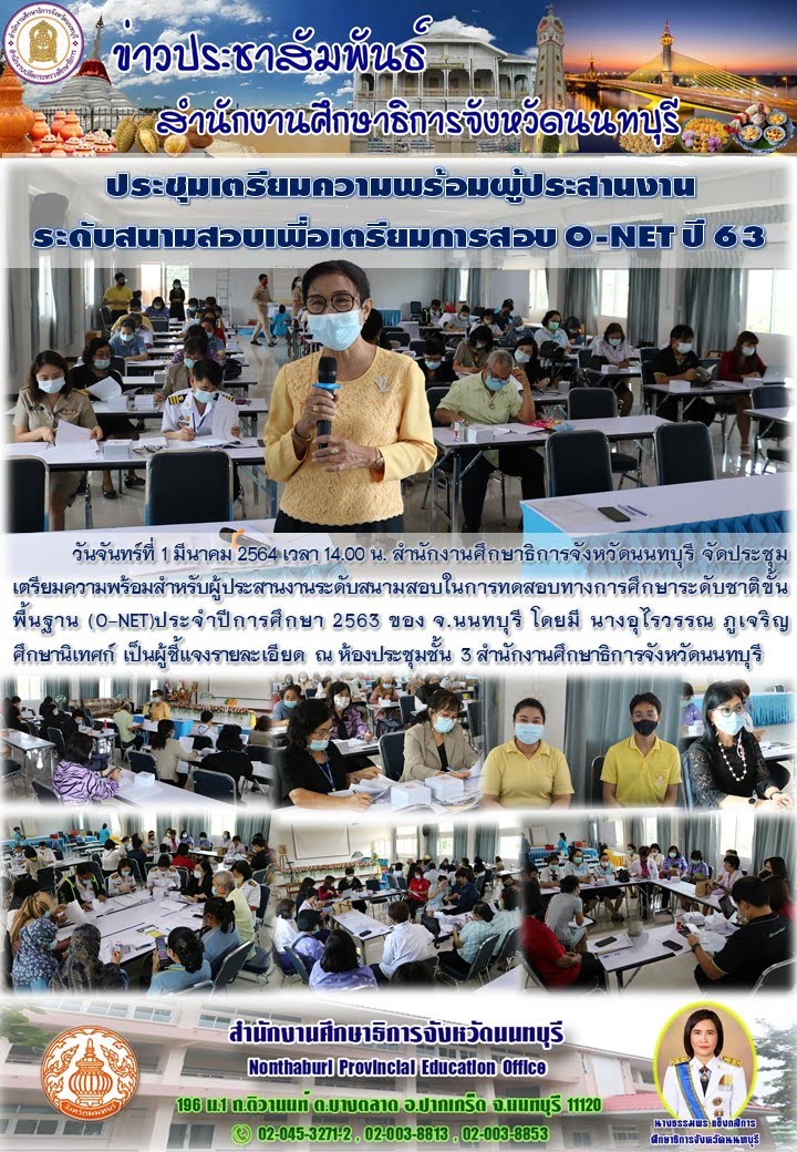 สำนักงาน ศธจ.นนทบุรี จัดประชุมเตรียมความพร้อมผู้ประสานงานระดับสนามสอบเพื่อเตรียมการสอบ O-NET ปีการศึกษา 2563 ณ ห้องประชุมใหญ่ชั้น 3 สำนักงานศึกษาธิการจังหวัดนทบุรี (1 มี.ค.64) ไฟล์แนบ : 1_มี.ค.64.jpg