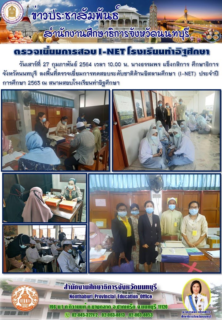 นางธรรมพร แข็งกสิการ ศธจ.นนทบุรี ลงพื้นที่ตรวจเยี่ยมการสอบ I-NET ประจำปีการศึกษา 2563 ณ โรงเรียนท่าอิฐศึกษา (27 ก.พ.64) ไฟล์แนบ : 27_ก.พ.64(1).jpg