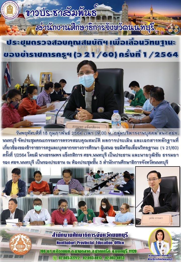 สำนักงาน ศธจ.นนทบุรี จัดประชุมตรวจสอบคุณสมบัติฯ เพื่อเลื่อนวิทยฐานะของข้าราชการครูฯ ครั้งที่ 1/64 ณ ห้องประชุมชั้น 3 สำนักงานศึกษาธิการจังหวัดนนทบุรี (18 ก.พ.64) ไฟล์แนบ : 18_ก.พ.64.jpg