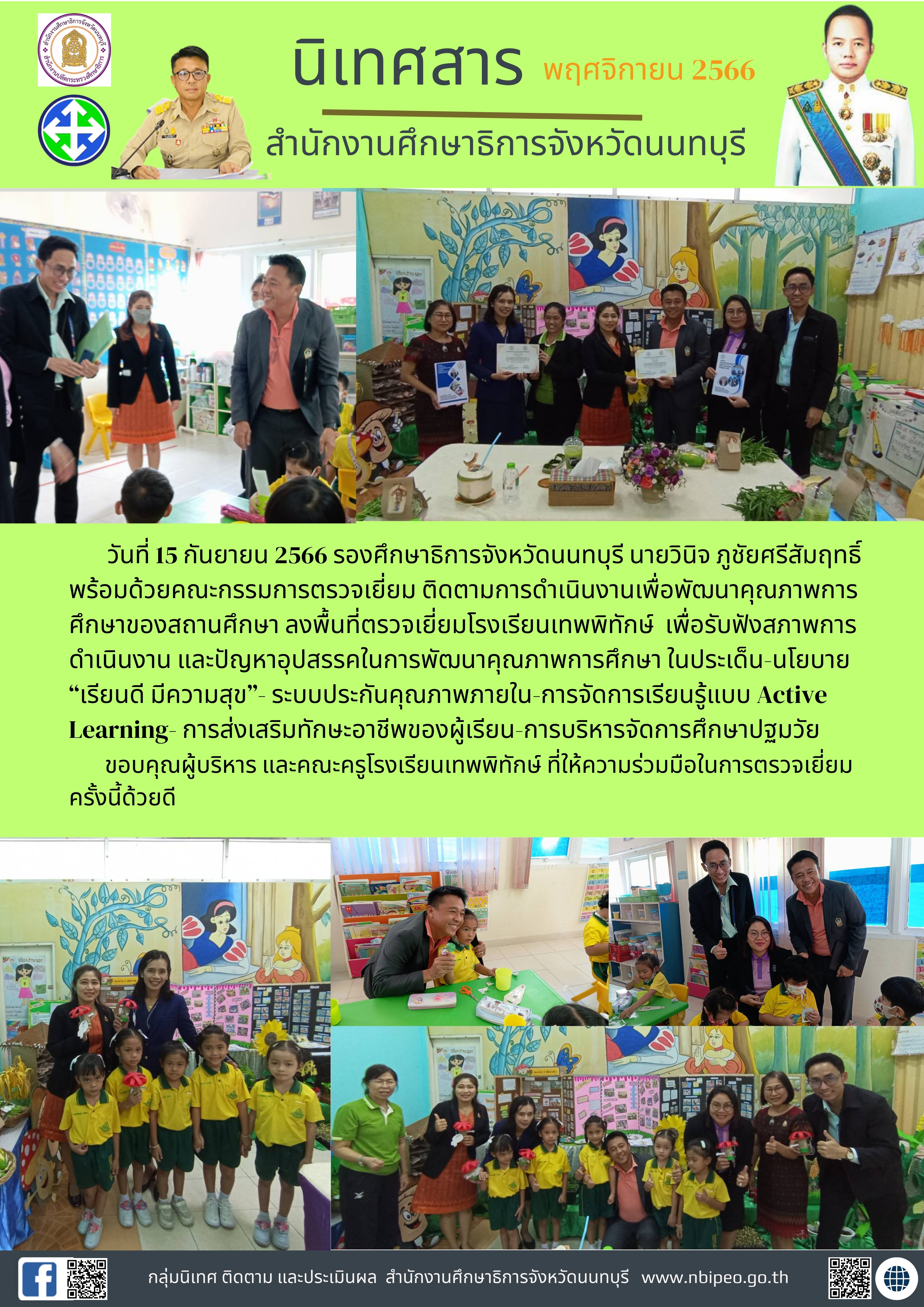 นายวินิจ ภูชัยศรีสัมฤทธิ์ รองศึกษาธิการจังหวัดนนทบุรี พร้อมคณะ ลงพื้นที่ตรวจเยี่ยมการดำเนินเพื่อพัฒนาคุณภาพการศึกษา โรงเรียนเทพพิทักษ์ วันที่ 15 พฤศจิกายน 2566 ไฟล์แนบ : นิเทศสาร.jpg