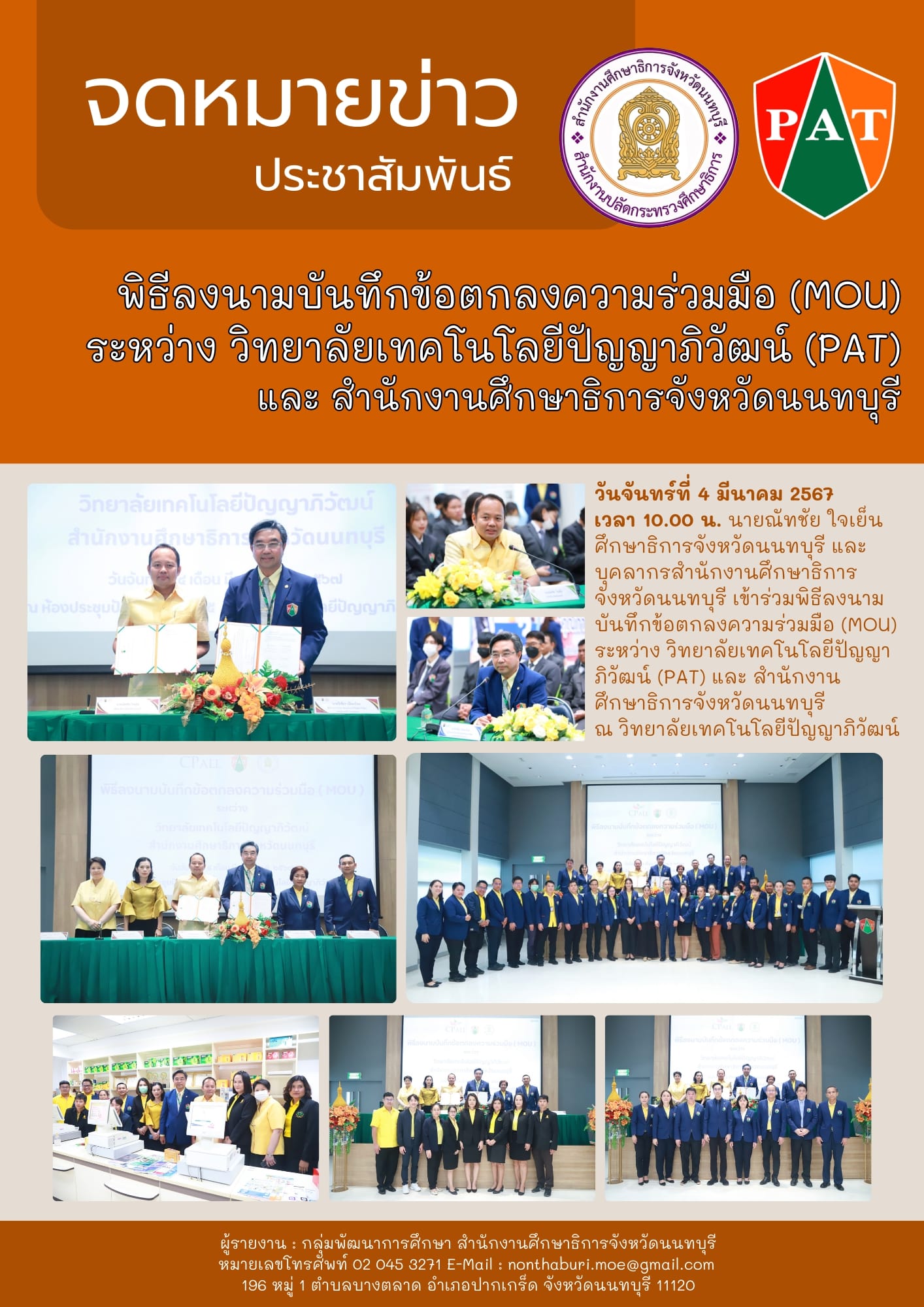 จดหมายข่าวพิธีลงนามบันทึกข้อตกลงความร่วมมือ (MOU) ระหว่าง วิทยาลัยเทคโนโลยีปัญญาภิวัฒน์ (PAT) และ สำนักงานศึกษาธิการจังหวัดนนทบุรี ไฟล์แนบ : mou.jpg