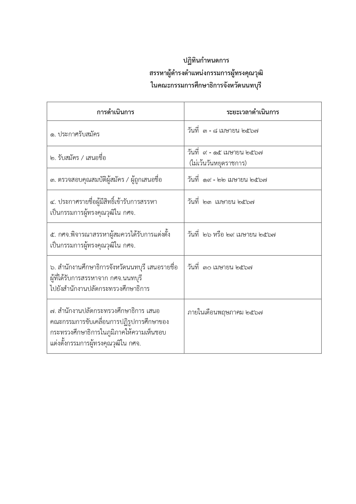 เรื่อง ประกาศรับสมัครบุคคลเข้ารับการสรรหาเป็นกรรมการผู้ทรงคุณวุฒิในคณะกรรมการศึกษาธิการจังหวัดนนทบุรี รายละเอียดตามกำหนดการสรรหา ดังแนบ ไฟล์แนบ : 1._ปฏิทิน_การสรรหา_กศจ._2567.pdf ไฟล์แนบ : 1._ปฏิทิน_การสรรหา_กศจ._2567_page-0001.jpg
