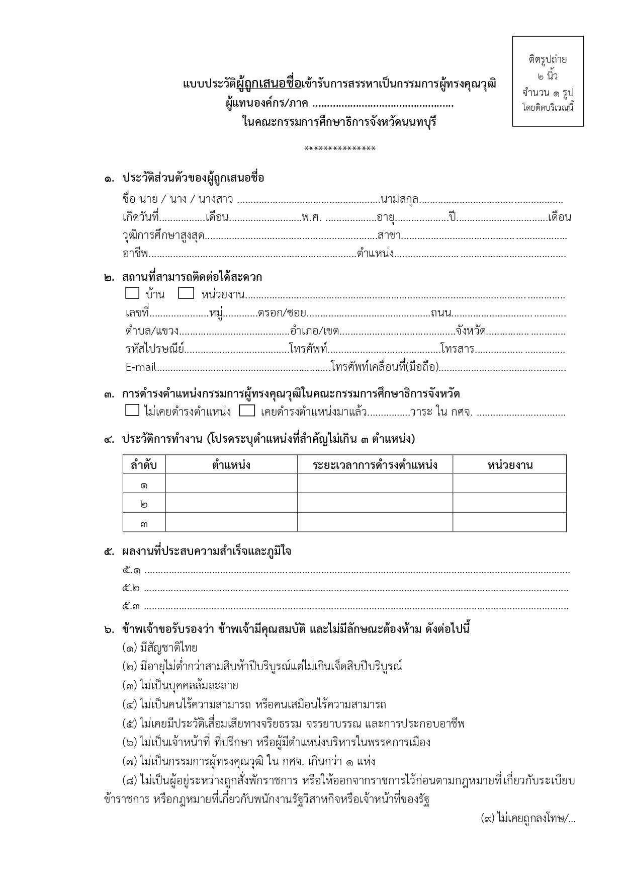 เรื่อง ประกาศรับสมัครบุคคลเข้ารับการสรรหาเป็นกรรมการผู้ทรงคุณวุฒิในคณะกรรมการศึกษาธิการจังหวัดนนทบุรี รายละเอียดตามกำหนด ใบประวัติผู้ถูกเสนอชื่อ ดังแนบ ไฟล์แนบ : 5._ใบประวัติผู้ถูกเสนอชื่อ_2567.pdf ไฟล์แนบ : 5._ใบประวัติผู้ถูกเสนอชื่อ_2567_page-0001.jpg