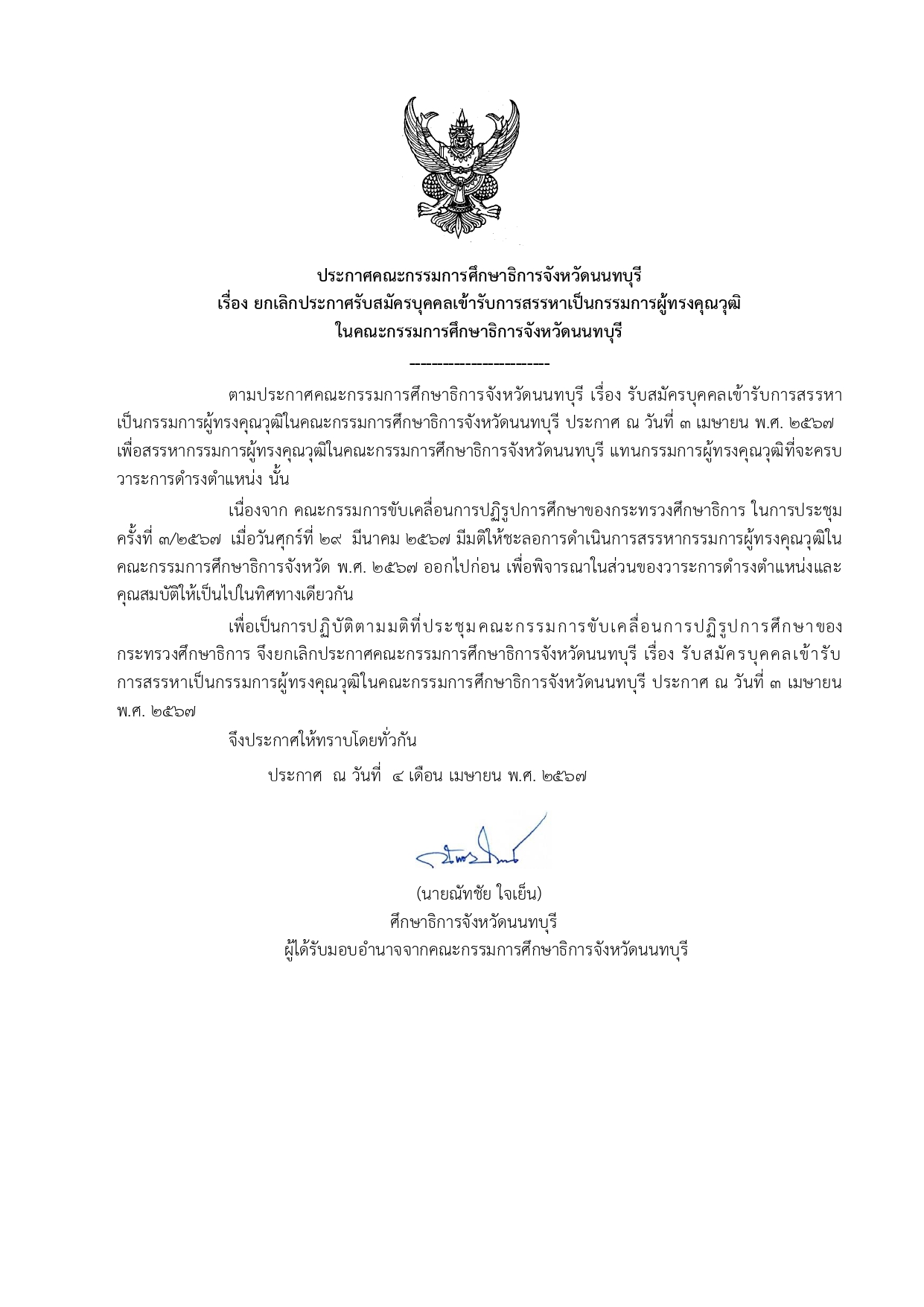 เรื่อง ยกเลิกประกาศรับสมัครบุคคลเข้ารับการสรรหาเป็นกรรมการผู้ทรงคุณวุฒิ ในคณะกรรมการศึกษาธิการจังหวัดนนทบุรี ไฟล์แนบ : ประกาศยกเลิกประกาศรับสมัครบุคคลเข้ารับการสรรหาเป็นกรรมการผู้ทรงคุณวุฒิ.pdf ไฟล์แนบ : ประกาศยกเลิกประกาศรับสมัครบุคคลเข้ารับการสรรหาเป็นกรรมการผู้ทรงคุณวุฒิ_01.jpg