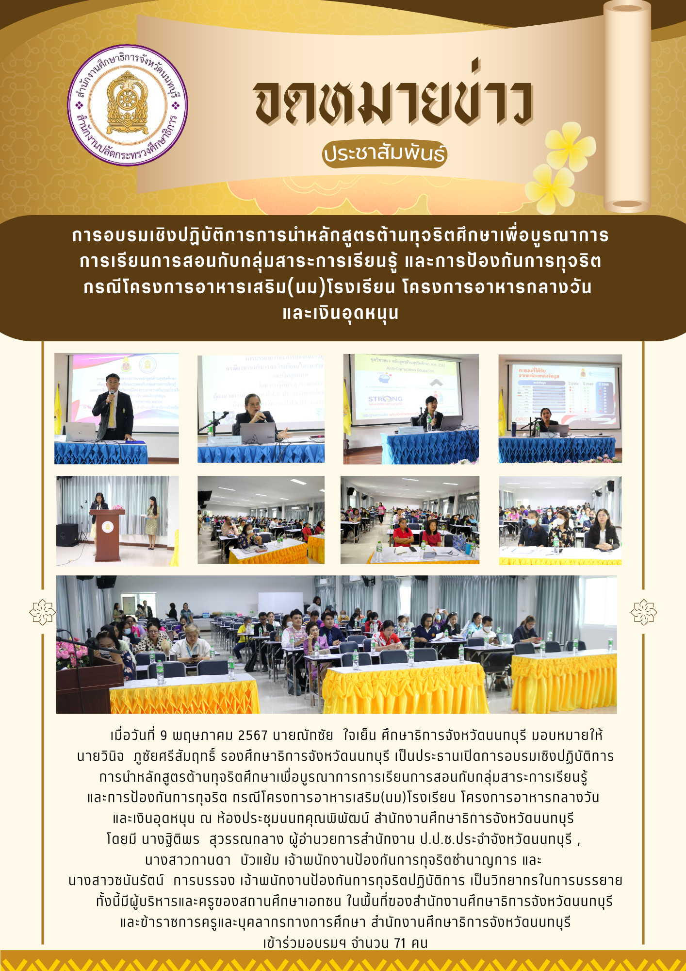 จดหมายข่าวประชาสัมพันธ์การอบรมเชิงปฏิบัติการการนำหลักสูตรต้านทุจริตศึกษาเพื่อบูรณาการการเรียนการสอนกับกลุ่มสาระการเรียนรู้ และการป้องกันการทุจริต กรณีโครงการอาหารเสริม(นม)โรงเรียน โครงการอาหารกลางวัน และเงินอุดหนุน ไฟล์แนบ : ข่าวประชาสัมพันธ์อบรมต่านทุจริตศึกษา.png