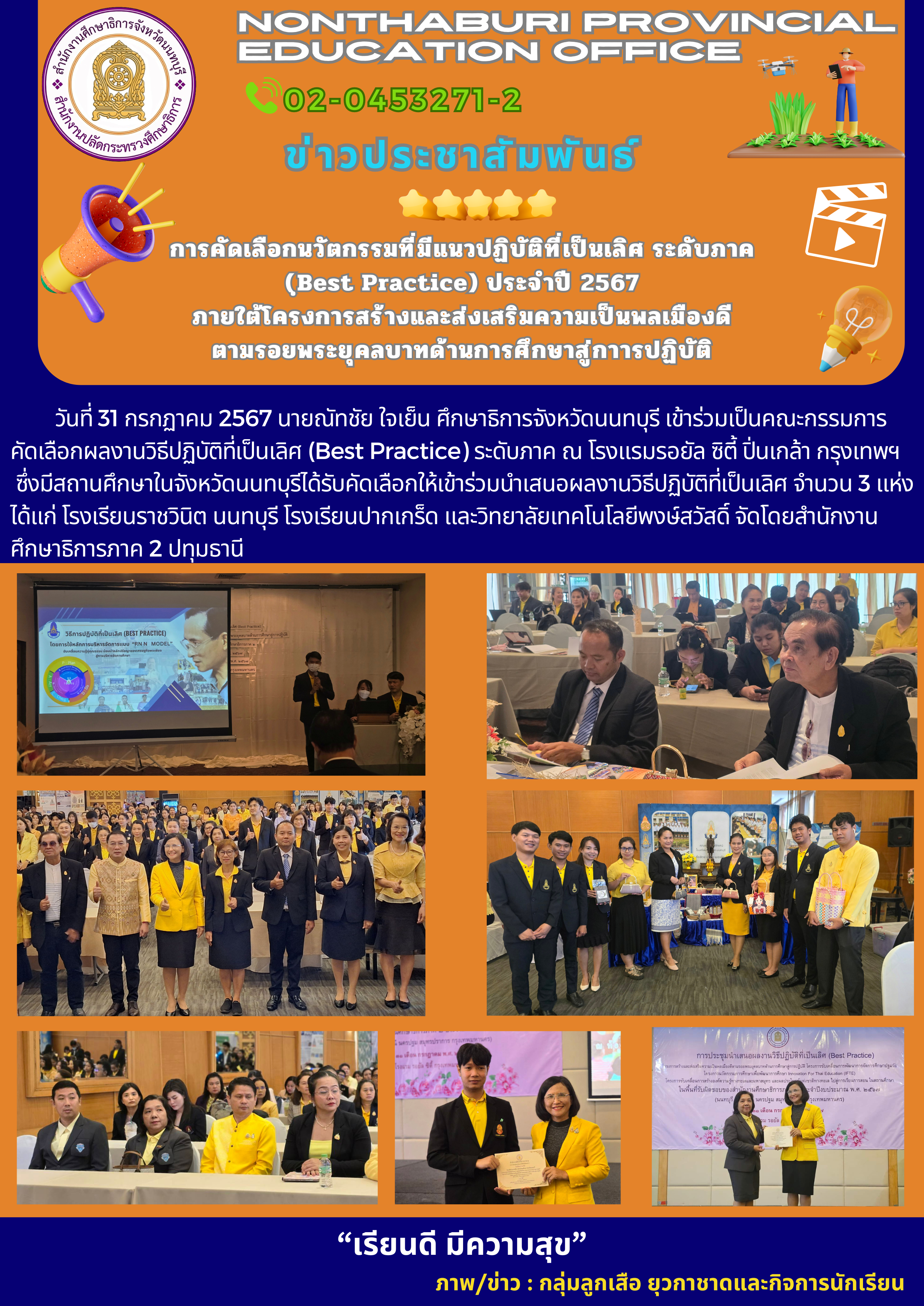การคัดเลือกผลงานวิธีปฏิบัติที่เป็นเลิศ (Best Practice) ระดับภาค ประจำปี 2567 ภายใต้โครงการสร้างและส่งเสริมความเป็นพลเมืองดีตามรอยพระยุคลบาท ด้านการศึกษาสู่การปฏิบัติ ไฟล์แนบ : ประกวดเบสท์.png