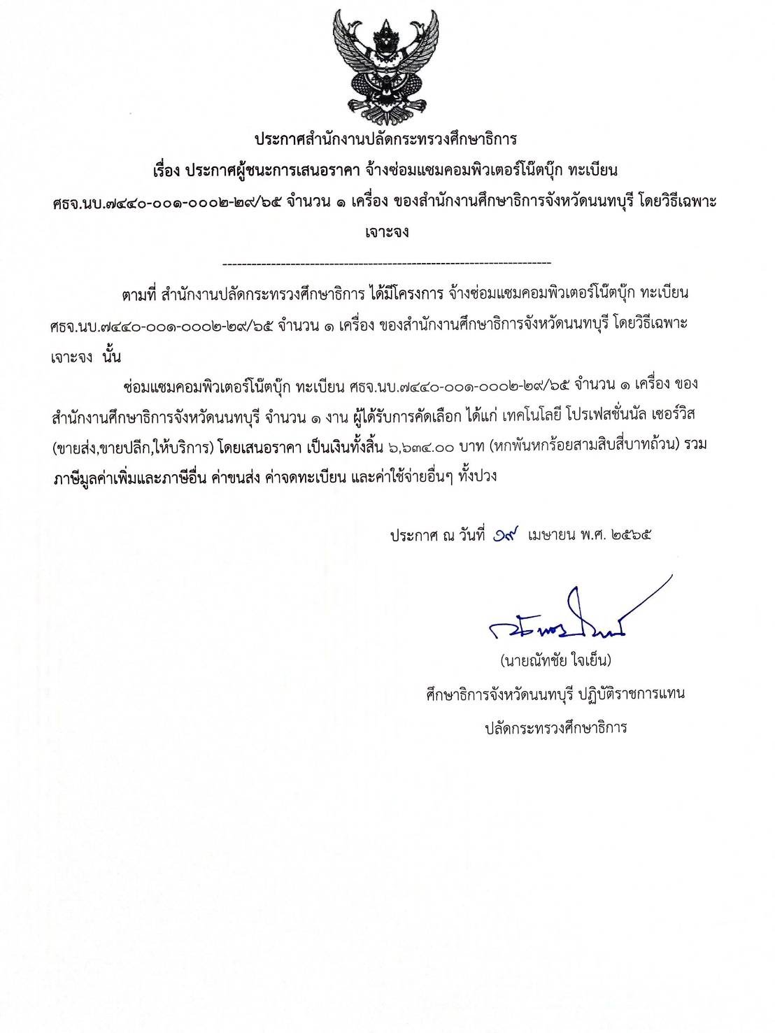 ประกาศผู้ชนะเสนอราคา จ้างซ่อมแซมคอมพิวเตอร์โน็ตบุ๊ก ทะเบียน ศธจ.นบ.7440-001-0002-29/65 จำนวน 1 เครื่อง ของสำนักงานศึกษาธิการจังหวัดนนทบุรี โดยวิธีเฉพาะเจาะจง ไฟล์แนบ : 41992.jpg