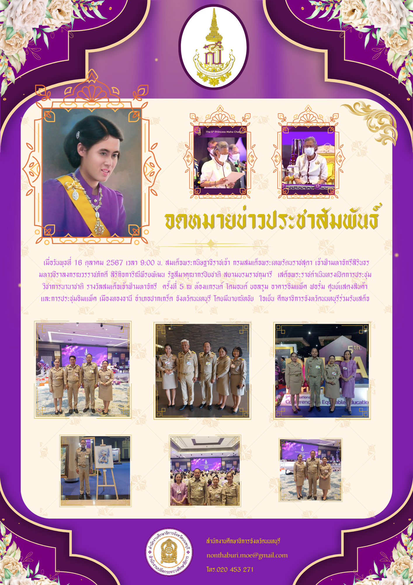 เข้ารับเสด็จสมเด็จพระกนิษฐาธิราชเจ้า กรมสมเด็จพระเทพรัตนราชสุดาฯ ในการประชุมวิชาการนานาชาติ รางวัลสมเด็จเจ้าฟ้ามหาจักรี ครั้งที่ 5 ไฟล์แนบ : สีม่วง_จดหมายข่าวประชาสัมพันธ์_ประกาศ_ข่า.png