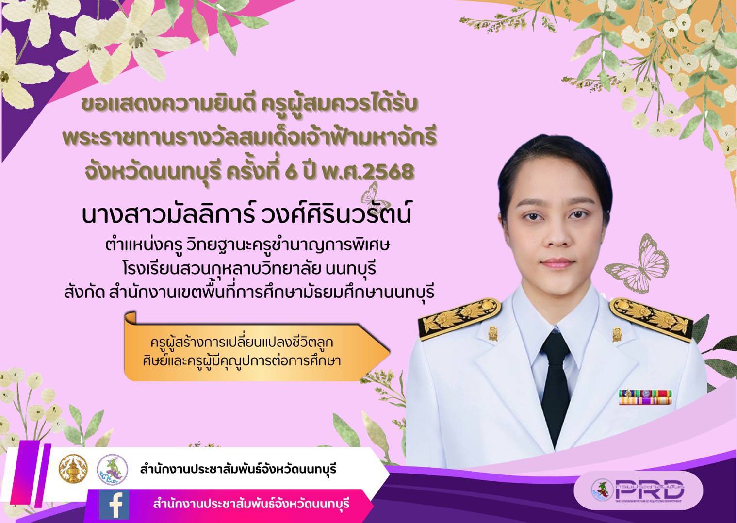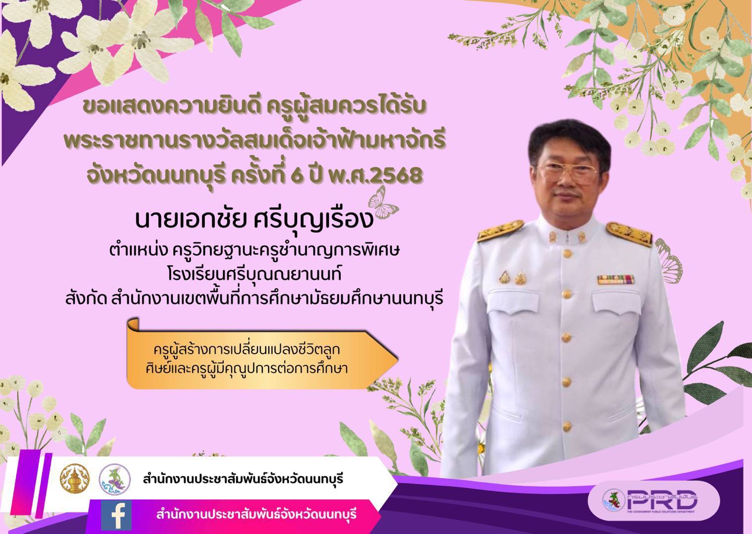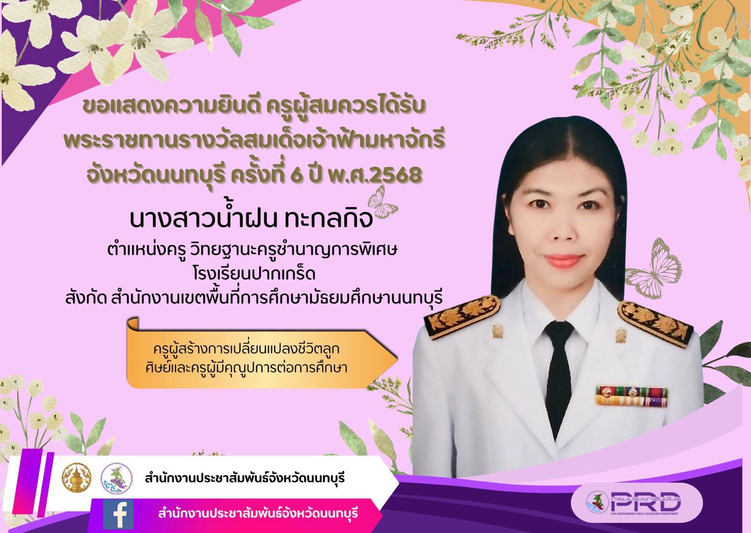 สำนักงานศึกษาธิการจังหวัดนนทบุรีขอแสดงความยินดีกับครูผู้ได้รับการคัดเลือกครูผู้สมควรได้รับพระราชทานรางวัลสมเด็จเจ้าฟ้ามหาจักรี จังหวัดนนทบุรี ครั้งที่ ๖ ปี ๒๕๖๘ ทั้ง ๓ ท่าน ไฟล์แนบ : 4990542_0.jpg ไฟล์แนบ : 4990543_0.jpg ไฟล์แนบ : 4990544_0.jpg