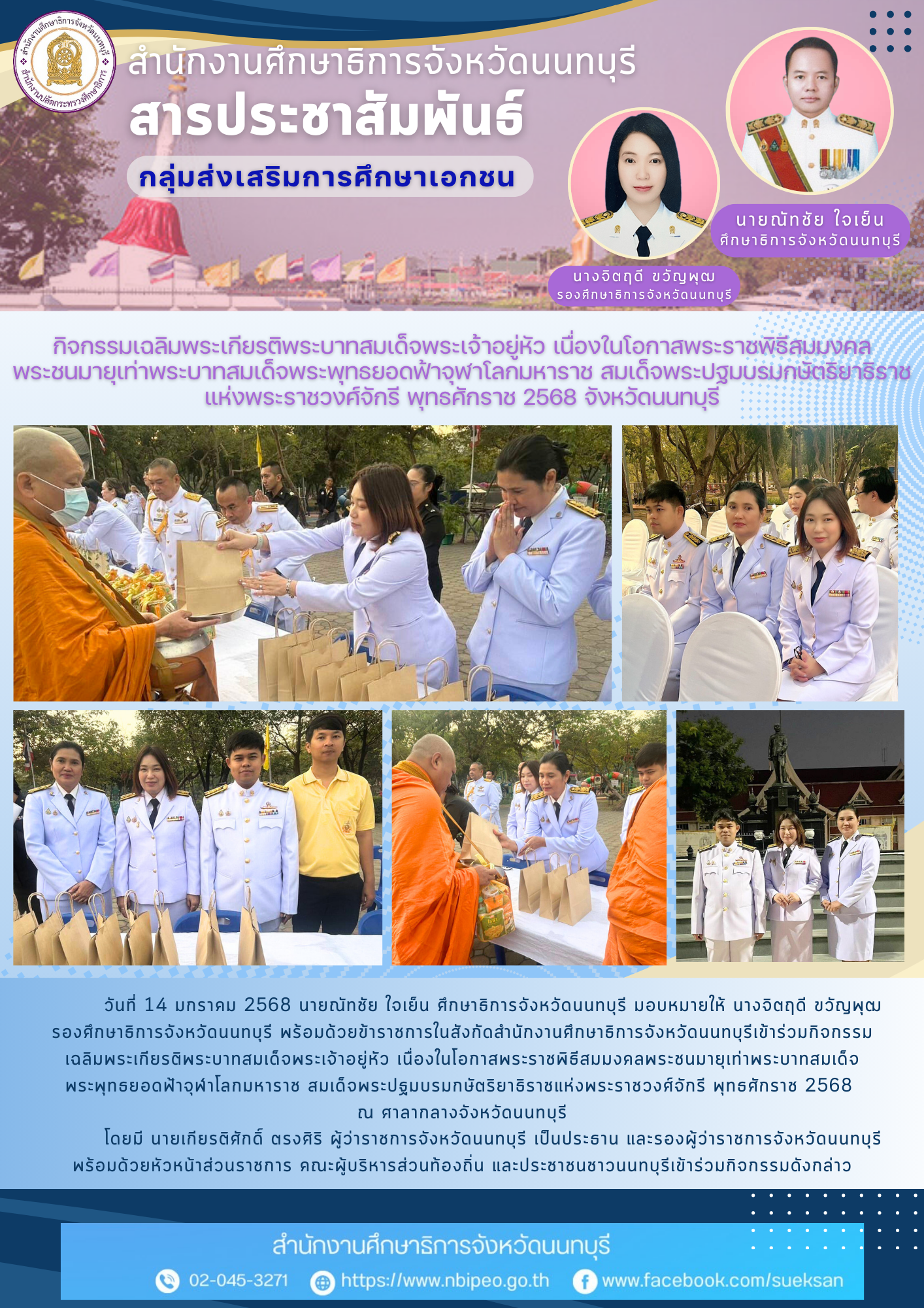 กิจกรรมเฉลิมพระเกียรติพระบาทสมเด็จพระเจ้าอยู่หัว เนื่องในโอกาสพระราชพิธีสมมงคล พระชนมายุเท่าพระบาทสมเด็จพระพุทธยอดฟ้าจุฬาโลกมหาราชสมเด็จพระปฐมบรมกษัตริยาธิราชแห่งพระราชวงศ์จักรี พุทธศักราช 2568 จังหวัดนนทบุรี ไฟล์แนบ : 29455.png