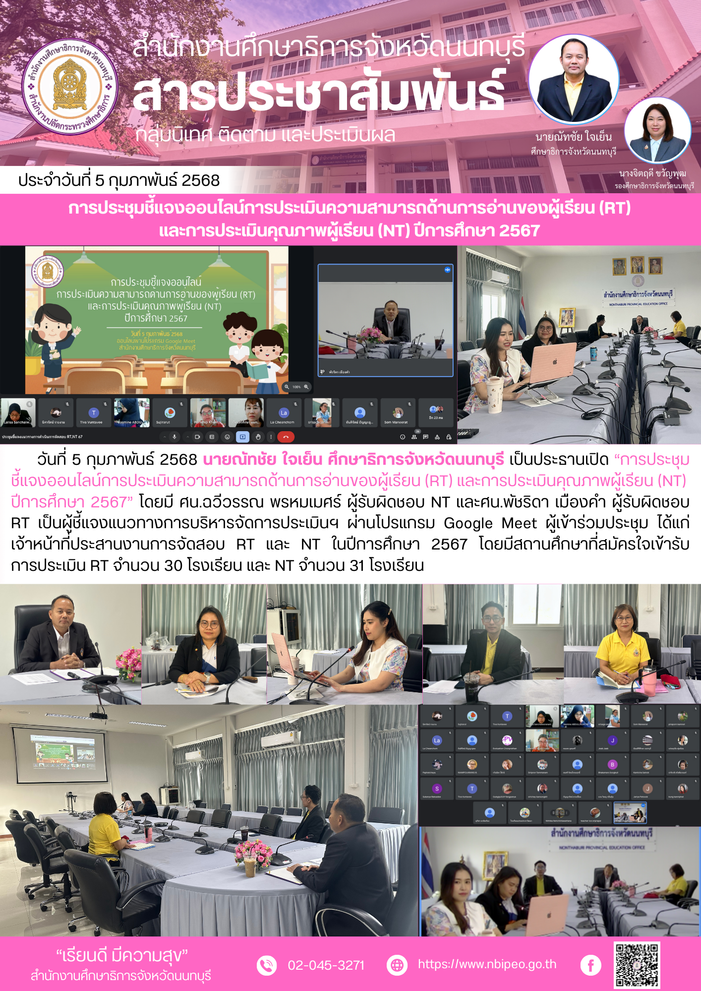 การประชุมชี้แจงออนไลน์การประเมินความสามารถด้านการอ่านของผู้เรียน (RT) และการประเมินคุณภาพผู้เรียน (NT) ปีการศึกษา 2567 ไฟล์แนบ : ประชาสัมพันธ์_ศน.ศธจ._งบ_68_(กพ).png