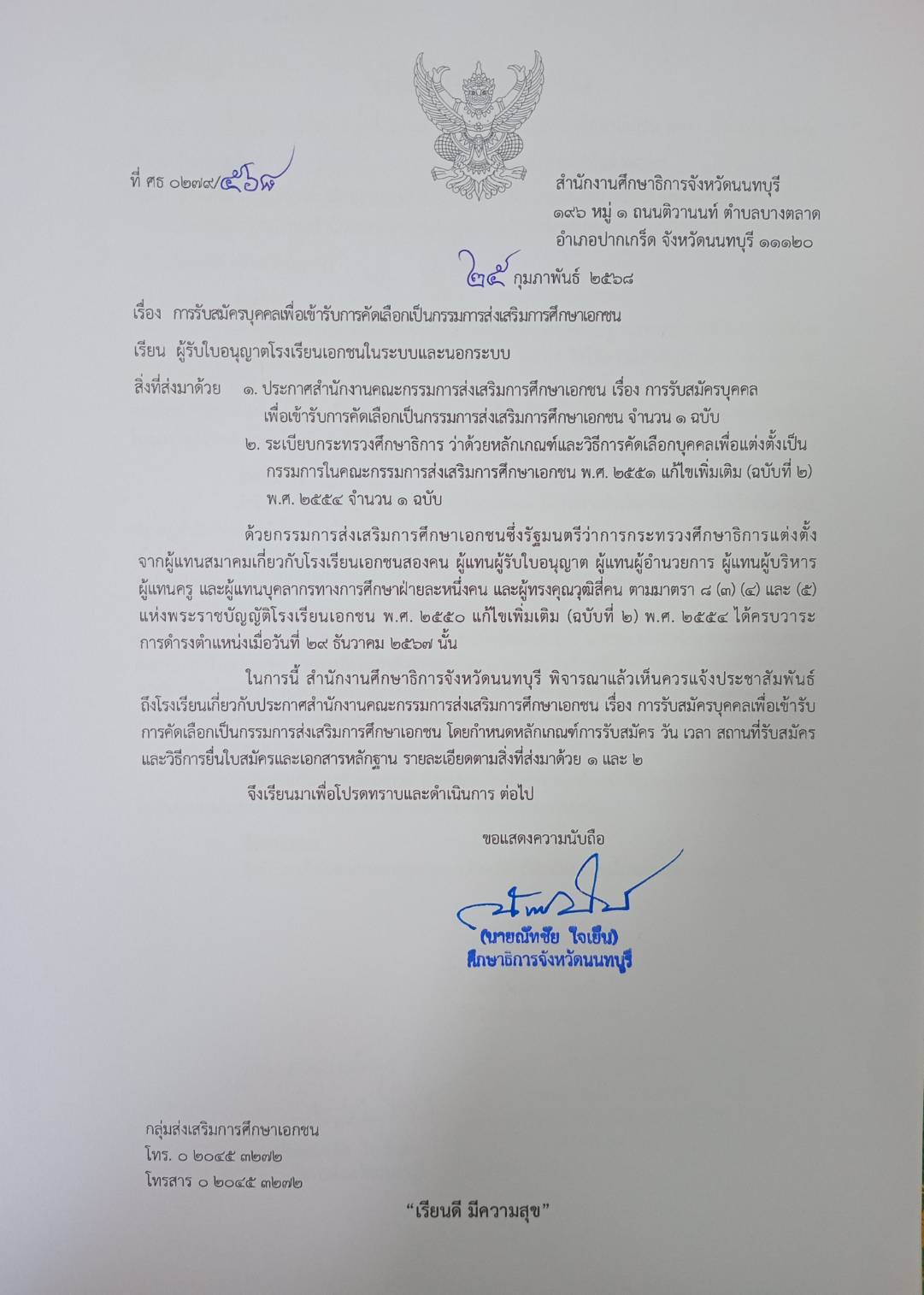 การรับสมัครบุคคลเพื่อเข้ารับการคัดเลือกเป็นกรรมการส่งเสริมการศึกษาเอกชน ไฟล์แนบ : 34307.jpg ไฟล์แนบ : การรับสมัครบุคคลเพื่อเข้ารับการคัดเลือกเป็นกรรมการส่งเสริมการศึกษาเอกชน.pdf