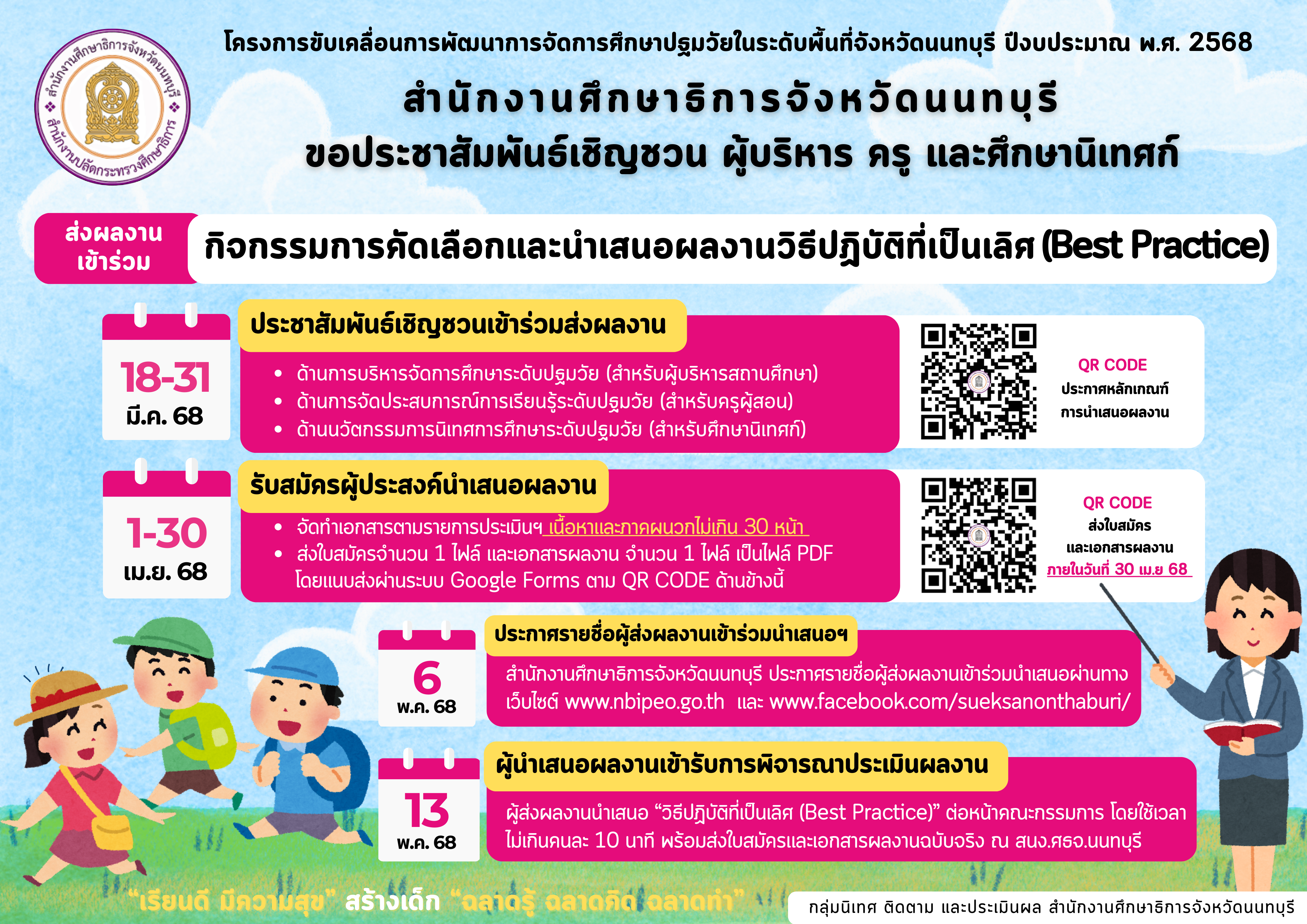 ขอเชิญชวนให้ผู้บริหารสถานศึกษา ครูผู้สอน และศึกษานิเทศก์ในสังกัด(สพฐ./สช./อปท.) โดยผู้ที่สนใจส่งผลงานเข้าร่วมกิจกรรมฯ สามารถส่งใบสมัครและเอกสารผลงานในรูปแบบไฟล์ PDF ผ่านระบบ Google Forms ภายในวันที่ 30 เมษายน 2568 และนำเสนอผลงานด้วยตนเองในวันที่ 13 พฤษภาคม 2568 ณ สำนักงานศึกษาธิการจังหวัดนนทบุรี
