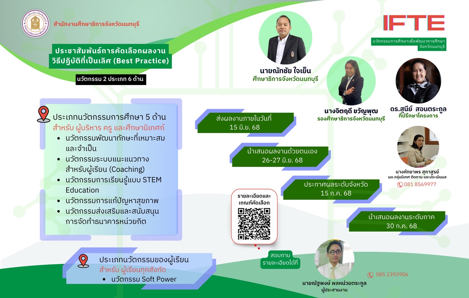 ประชาสัมพันธ์การคัดเลือกผลงานวิธีปฏิบัติที่เป็นเลิศ (Best Practice) ภายใต้โครงการ Innovation For Thai Education (IFTE) นวัตกรรมการศึกษาเพื่อพัฒนาการศึกษาจังหวัดนนทบุรี ประจำปี 2568 ไฟล์แนบ : s__12337167.jpg