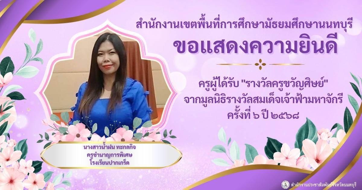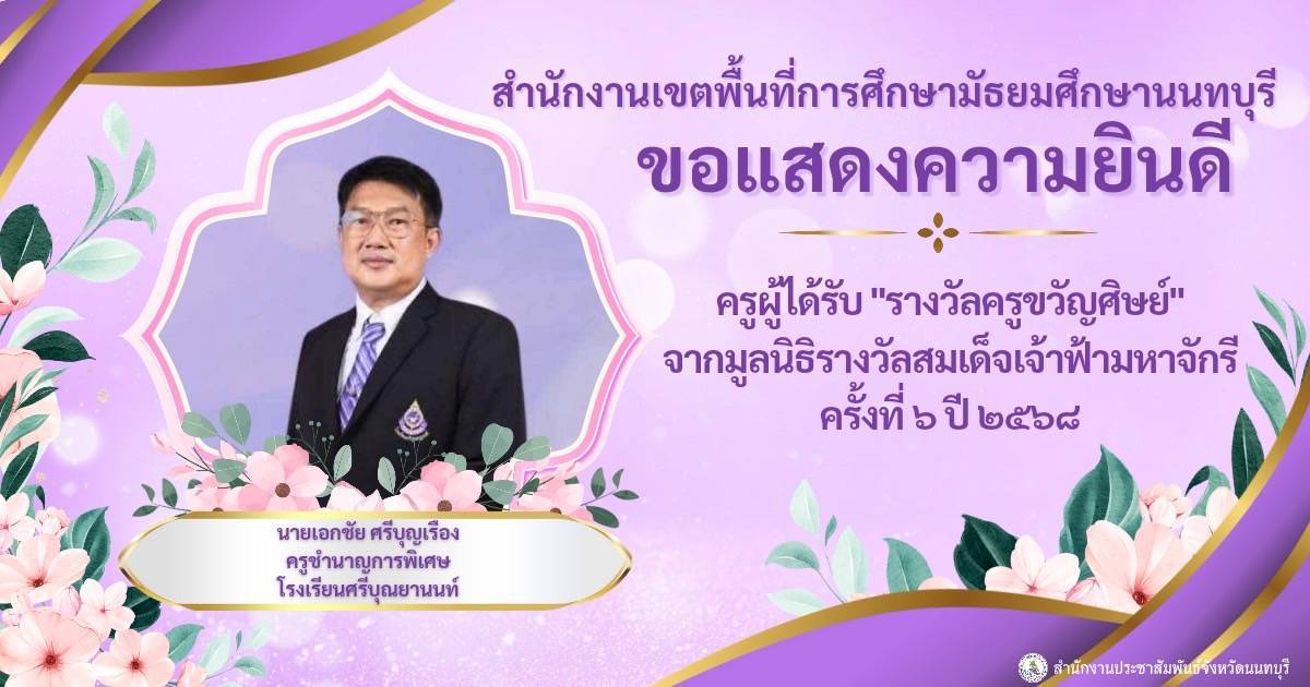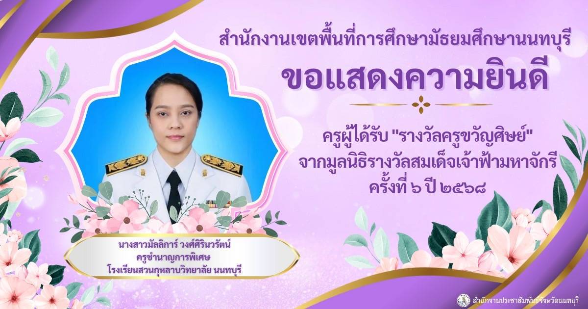????สำนักงานศึกษาธิการจังหวัดนนทบุรี ขอแสดงความยินดีข้าราชการครูทั้ง 3 ท่าน ได้รับรางวัล "ครูขวัญศิษย์" จากมูลนิธิรางวัลสมเด็จเจ้าฟ้ามหาจักรี ครั้งที่ 6 ปี 2568
