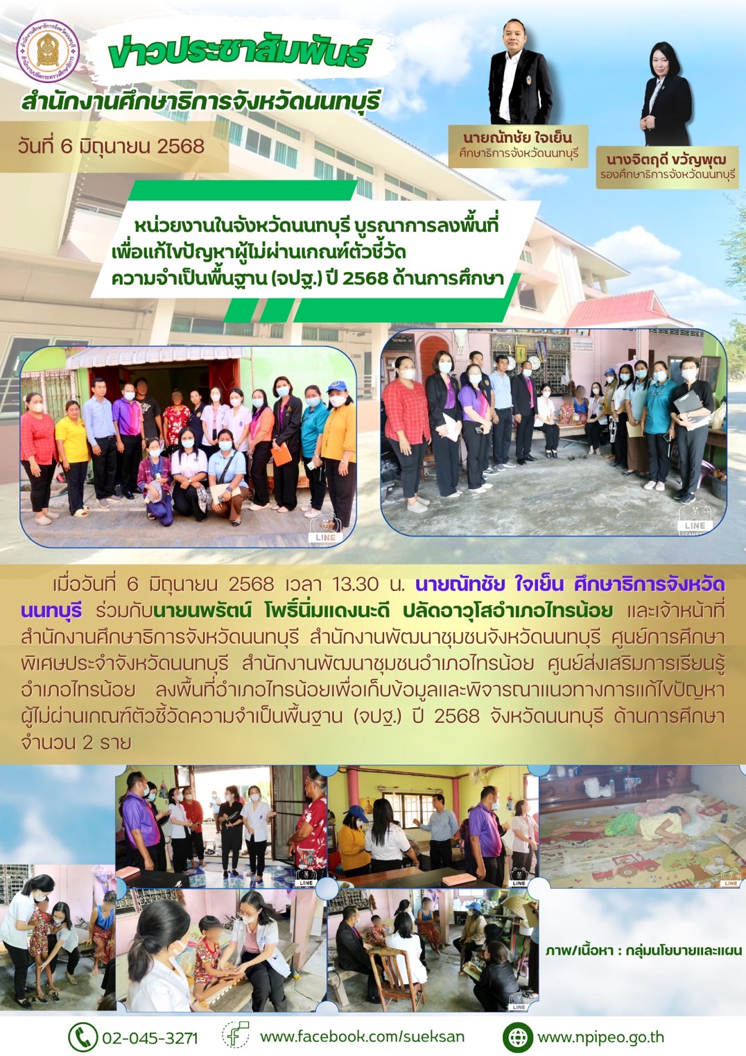 หน่วยงานในจังหวัดนนทบุรี บูรณาการลงพื้นที่เพื่อแก้ไขปัญหาผู้ไม่ผ่านเกณฑ์ตัวชี้วัดความจำเป็นพื้นฐาน (จปฐ.) ปี 2568 ด้านการศึกษา ไฟล์แนบ : s__6078480.jpg