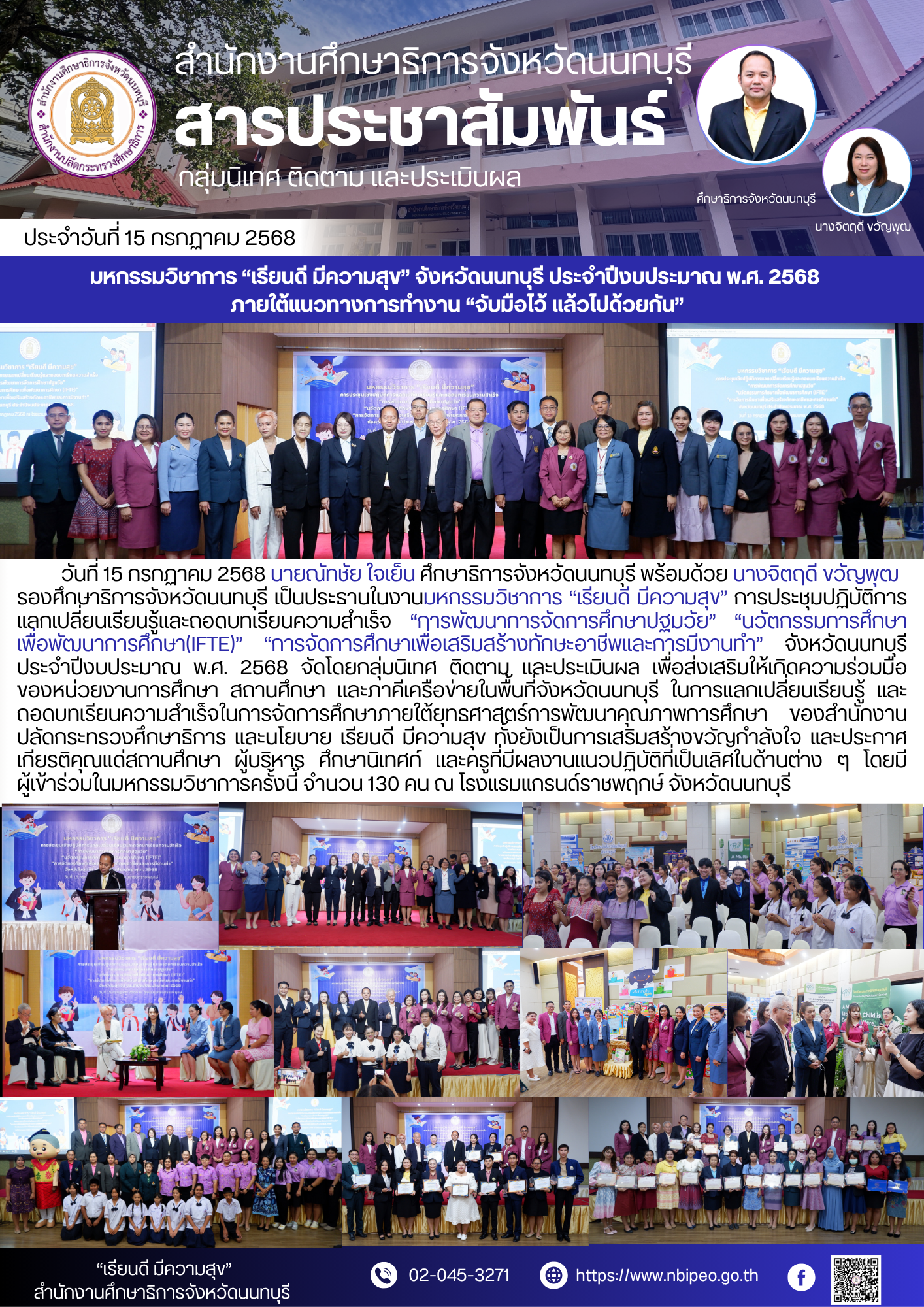 มหกรรมวิชาการ “เรียนดี มีความสุข” จังหวัดนนทบุรี ประจำปีงบประมาณ พ.ศ. 2568 ภายใต้แนวทางการทำงาน “จับมือไว้ แล้วไปด้วยกัน” ณ โรงแรมแกรนด์ราชพฤกษ์ จังหวัดนนทบุรี ไฟล์แนบ : ประชาสัมพันธ์_ศน.ศธจ._งบ_68_(มิย)_(3).png
