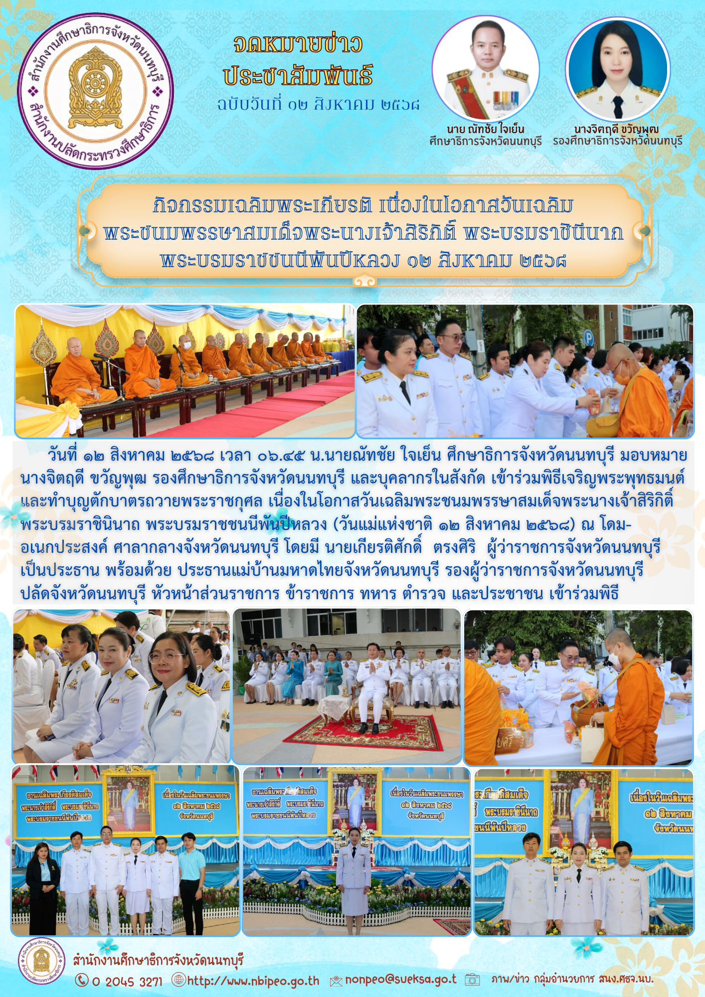 พิธีเจริญพระพุทธมนต์และทำบุญตักบาตรฯเฉลิมพระเกียรติ เนื่องในโอกาสวันเฉลิมพระชนมพรรษาสมเด็จพระนางเจ้าสิริกิติ์ พระบรมราชินีนาถ พระบรมราชชนนีพันปีหลวง ๑๒ สิงหาคม ๒๕๖๘ ไฟล์แนบ : ๑๒_สิงหาคม_๒๕๖๘.png