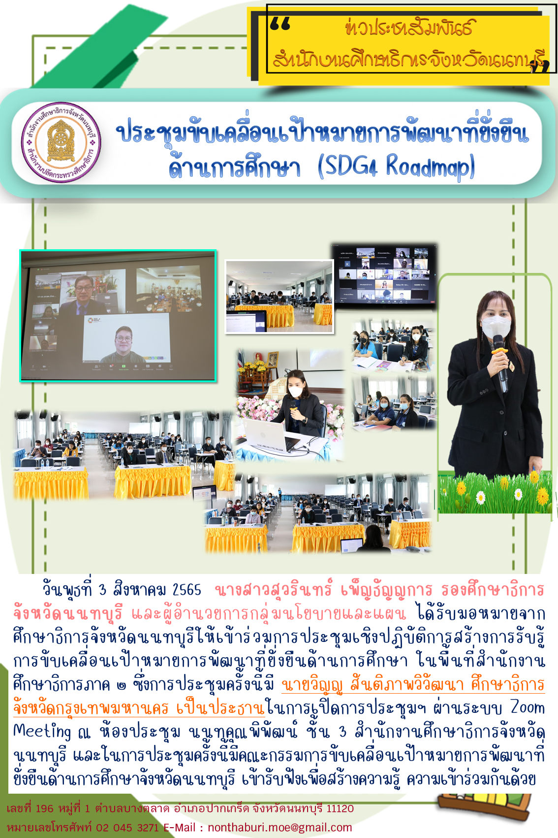 นายณัทชัย ใจเย็น ศึกษาธิการจังหวัดนนทบุรี มอบหมายให้นางสาวสุวรินทร์ เพ็ญธัญญการ รองศึกษาธิการจังหวัดนนทบุรี เข้าร่วมการประชุมโครงการขับเคลื่อนเป้าหมายการพัฒนาที่ยั่งยืนด้านการศึกษา (SDG4 Roadmap) จังหวัดนนทบุรี ไฟล์แนบ : 3-8-2565-ประชุม SDG4.png
