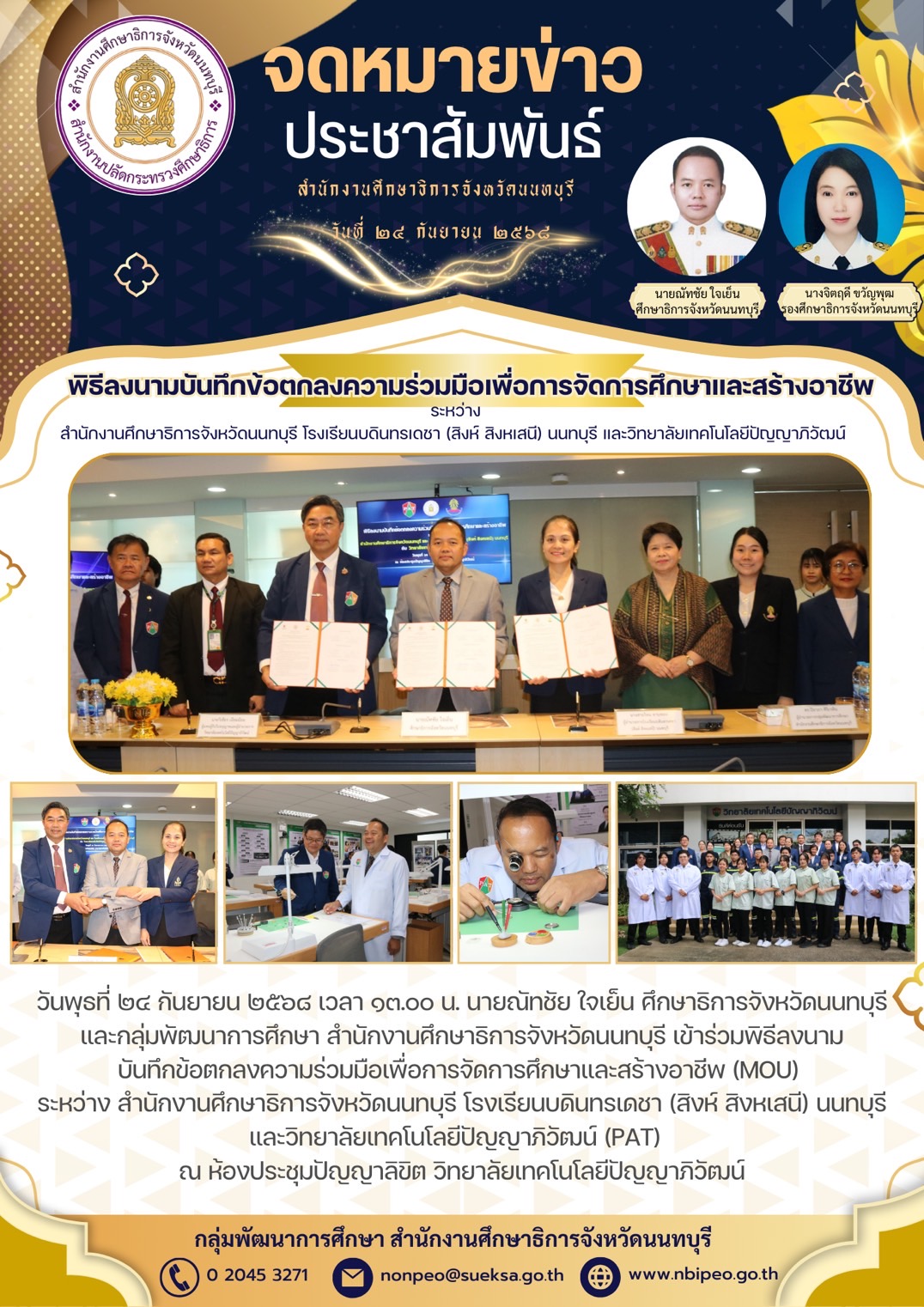 พิธีลงนามบันทึกข้อตกลงความร่วมมือเพื่อการจัดการศึกษาและสร้างอาชีพ ระหว่าง สำนักงานศึกษาธิการจังหวัดนนทบุรี โรงเรียนบดินทรเดชา (สิงห์ สิงหเสนี) นนทบุรี และวิทยาลัยเทคโนโลยีปัญญาภิวัฒน์ ไฟล์แนบ : s__323944519.jpg