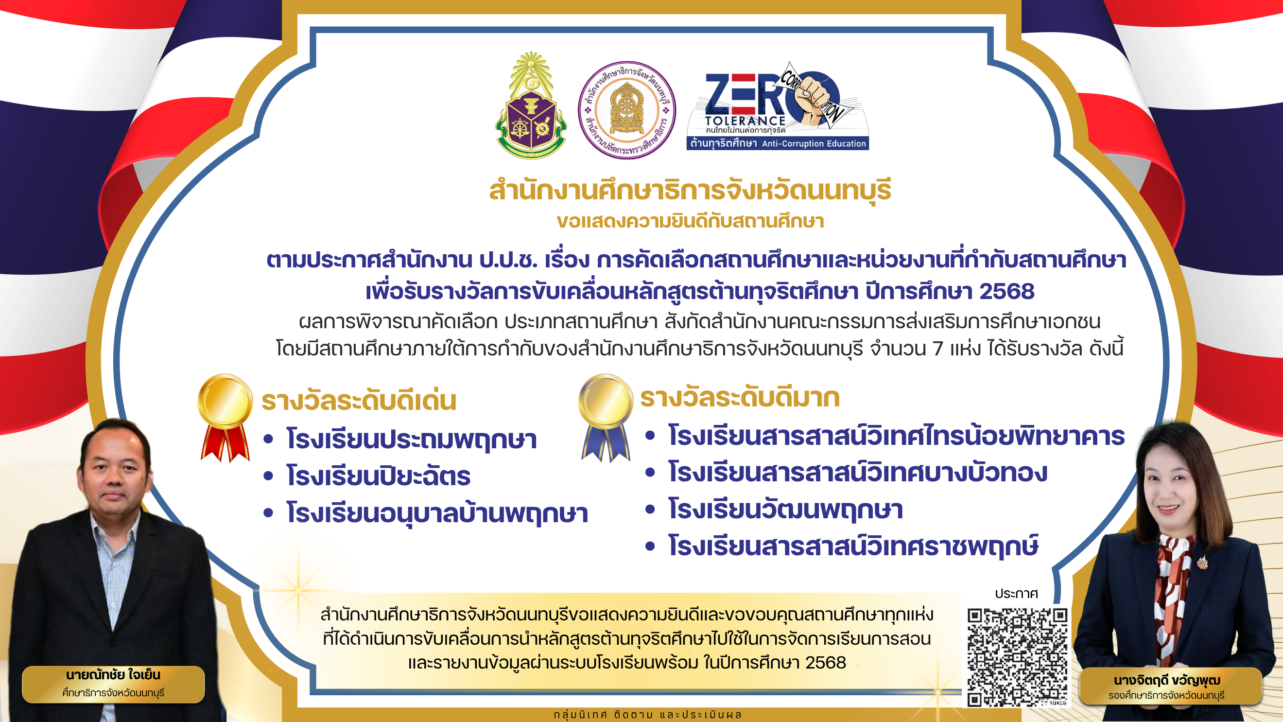 ผลการคัดเลือกสถานศึกษาและหน่วยงานที่กำกับสถานศึกษา เพื่อรับรางวัลการขับเคลื่อนหลักสูตรต้านทุจริตศึกษา ปีการศึกษา 2568 ผลการพิจารณาคัดเลือก ประเภทสถานศึกษา สังกัดสำนักงานคณะกรรมการส่งเสริมการศึกษาเอกชน ไฟล์แนบ : bg12354321_(2).png ไฟล์แนบ : ประกาศ_ป.ป.ช_รางวัลการขับเคลื่อนหลักสูตรต้าน_ระดับดีเด่น.pdf ไฟล์แนบ : ประกาศ_ป.ป.ช_รางวัลการขับเคลื่อนหลักสูตรต้าน_ระดับดีมาก.pdf