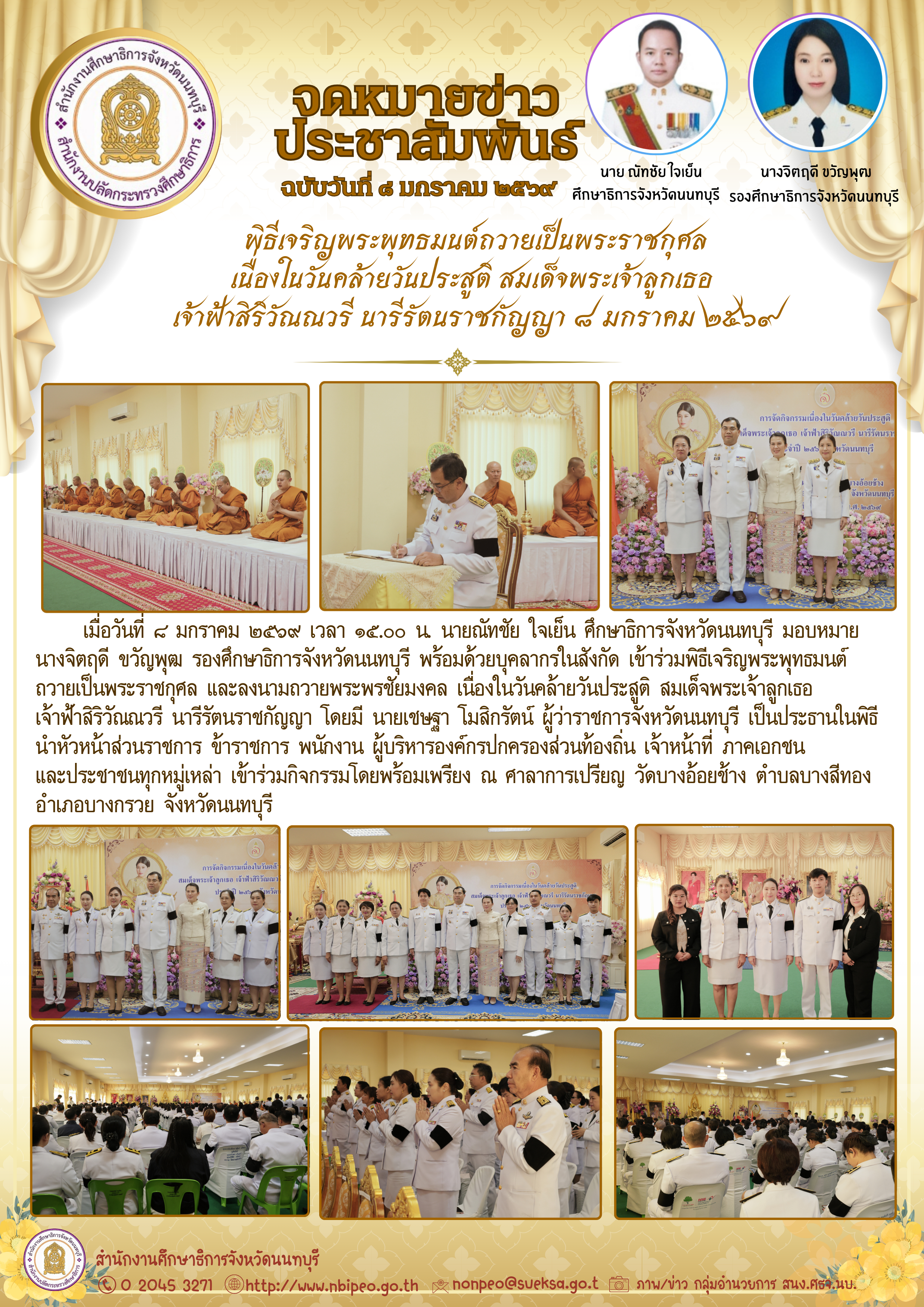 พิธีเจริญพระพุทธมนต์ถวายเป็นพระราชกุศลเนื่องในวันคล้ายวันประสูติ สมเด็จพระเจ้าลูกเธอ เจ้าฟ้าสิริวัณณวรี นารีรัตนราชกัญญา ๘ มกราคม ๒๕๖๙ ไฟล์แนบ : วันคล้ายวันประสูติ_8_ม.ค.69.png