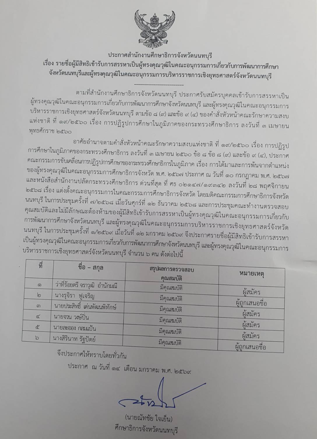 รายชื่อผู้มีสิทธิเข้ารับการสรรหาเป็นผู้ทรงคุณวุฒิในคณะกรรมการเกี่ยวกับการพัฒนาการศึกษาจังหวัดนนทบุรีและผู้ทรงคุณวุฒิในคณะอนุกรรมการบริหารราชการเชิงยุทธศาสตร์จังหวัดนนทบุรี ไฟล์แนบ : 377035.jpg