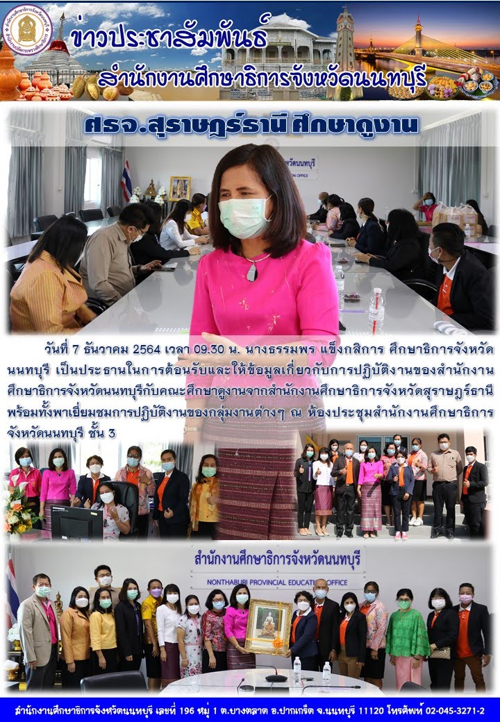 สำนักงาน ศธจ.นนทบุรี ให้การต้อนรับและให้ข้อมูลในการปฏิบัติงานกับคณะศึกษาดูงานจาก สำนักงาน ศธจ.สุราษฎร์ธานี ณ ห้องประชุมสำนักงานศึกษาธิการจังหวัดนนทบุรี ชั้น 3 (7 ธ.ค.64) ไฟล์แนบ : 641207.jpg
